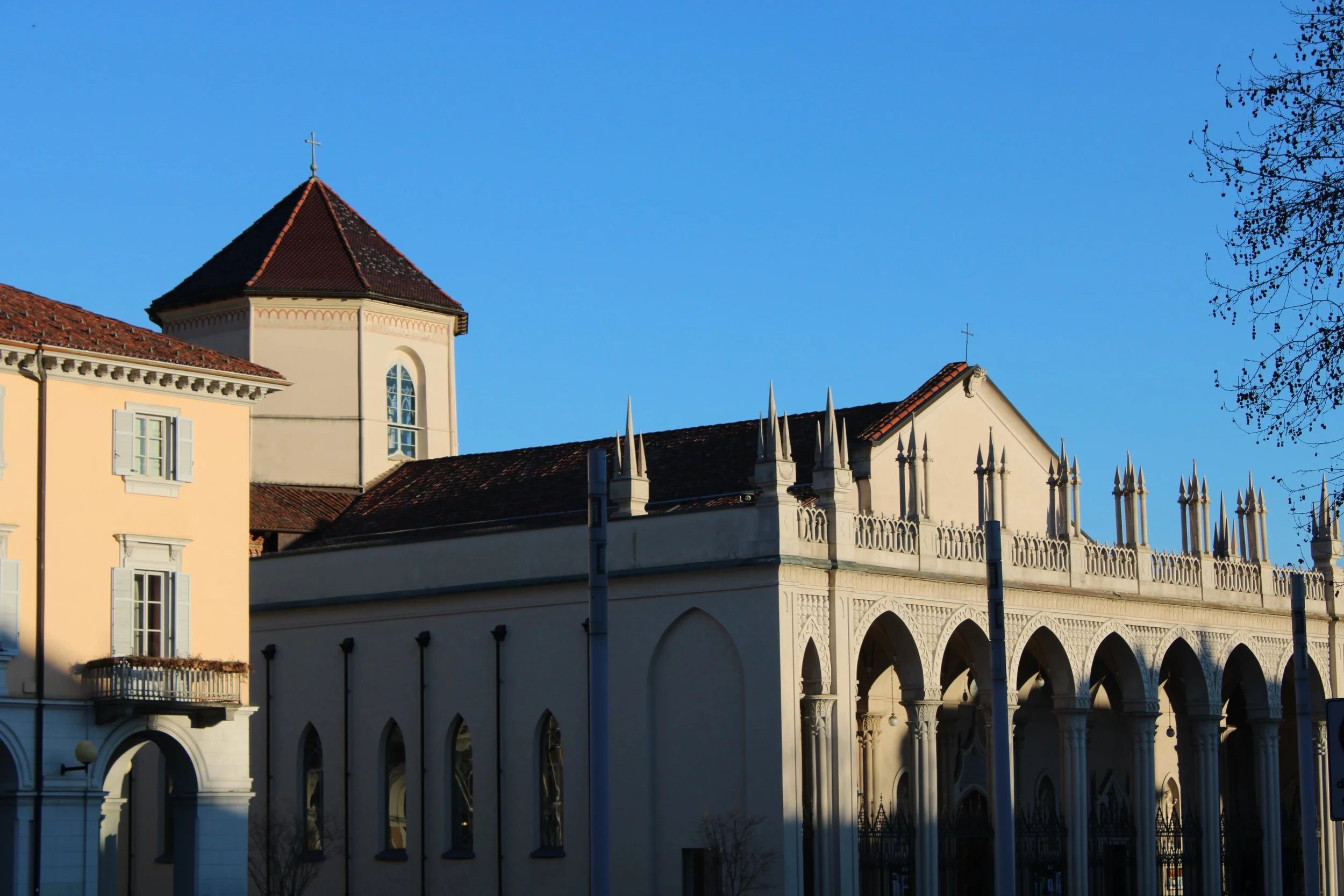 L’ampio porticato neogotico della Cattedrale risale al 1825 su progetto dell’arch. Felice Marandono, realizzato dal maestro Mosca del Vandorno, sotto la direzione degli architetti Pietro Beltramo e Gaspare Maggia.